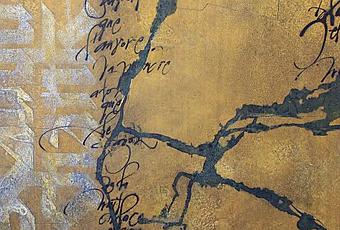 Technique : fond de pigment jaune oxyde clair sur médium enduit. Caractères tracés à l'automatic pen en blanc de titane. Ecriture libre réalisée à la plume Speedball n°5, avec de l'encre à base de gomme laque bleu indigo.