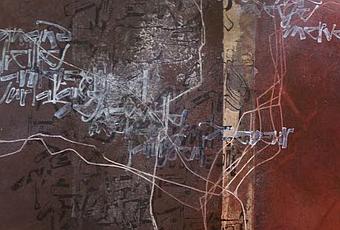 Technique : médium enduit, modeling paste mélangée à du pigment ocre rouge, blanc de titane et noir de fumée, lignes gravées à la gouge, voile d'acrylique ivoire. Écritures au tire-ligne de John Neal.