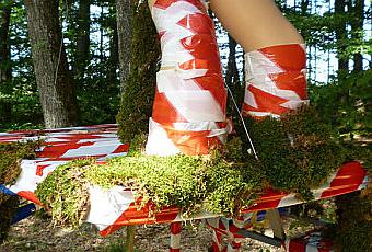 Red zone prend ses couleurs complémentaires, le coté ludique s'affirme, les pieds sur la table, enrubannés de rouge. Le tout sur un nid de mousse.