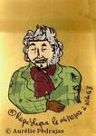 Je l' ai déjà croisés plusieurs fois sur la ligne 11... Ce vagabond des strapontins et quais du métropolitain a une allure différente des autres gens de misère... Son allure de dandy fait de pacotilles, son look de baron fait de bouts de chiffons surpprends lorsqu' on le voit pour la première fois... Une pérruque grise chiffonnée et enrubannée sur le front, un foulard miteux noué autour du cou, des gants de cuir usés, une veste rapiécée avec des bouts de plastiques...malgré l'état miséreux de ses vêtements, celui que je surnomme "le clochard pirate" soigne son allure, et réussi à sa manière à être élégant. Cette fois ci je l'ai repéré, j'ai reconnu sa coiffe, et me suis placée dans un coin du wagon pour le croquer. Je l'observe en train de marmonner, constatant d'un air navré qu'il n'est plus en contact avec notre réalité. Croquis terminé, je ferme mon carnet en espérant le recroiser bientôt...