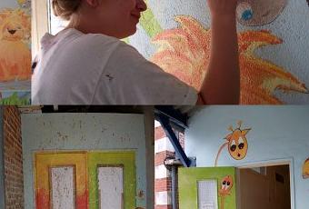 Voici l'avancé du travail ! ils vont super vite ! La girafe a été réalisé par une petite fille qui s'appelle Marie, j'étais épatée par la précision et comme elle comprenait vite et bien ce que je lui disait en ce qui concerne les ombres et les lumières ! on a peint plusieurs portes en utilisant des éponges et on a encore fait du lancé de peinture ! Les enfants ressortent en général couvert de peinture de la tête au pied ! qu'est-ce qu'ils me font rire ! vive les enfants et leur spontanéité !