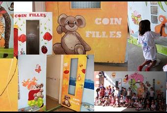 La semaine a été bien remplies mais pour mon plus grand plaisir ! J'adore faire de la peinture avec les enfants ! d'ailleurs, le lion et le tigre existe grâce à eux. Le premier matin je leur expliquait qu'il me manquait quelque chose pour que ça soit moins vide et c'est une petite fille qui m'a demandé de faire un lion. Puis pendant un atelier, Lola m'a suggéré de rajouter un petit tigre à côté du lion ! Et voilà le tour était joué ! Et puis c'était trop chouette d'entendre des "c'est trop jolie !", " c'est moi qui a fait ça", "toi t'es le singe", "et toi, t'es l'éléphant", " et toi t'es la p'tite grosse qui tient son nounours", "comment tu fais pour dessiner comme ça ?", "moi ma copine elle dit que je dessine pas bien alors que je dessine bien", "pourquoi tu fais ça ?" Voilà un peu tout ce que je pouvais entendre en faisant la peinture ! Je suis nostalgique ! Un grand merci à toi Sandrine (comme je sais que tu viens sur mon blog ;-) ) De me permettre de connaître de jolis moments comme ceux-là, merci beaucoup aux animateurs qui sont super sympa et à tous les enfants qui étaient super enthousiaste de réaliser avec moi cette fresque !