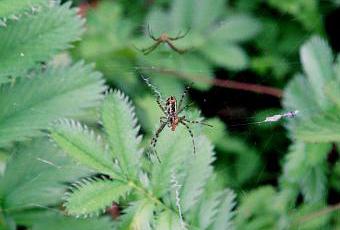 Une belle araignée est en apparence immobile au milieu de la toile. Ce que vous voyez c'est la face ventrale d'une femelle argiope fasciée, Argiope bruennichi. Derrière elle et un peu au-dessus, sur une autre toile il me semble, il y a une autre araignée beaucoup plus petite. Mais je n'avais pas remarqué cette araignée plus petite et plus terne. Je ne l'ai vue que sur les photos. Si je l'avais remarquée, j'aurais suivi la scène jusqu'au dénouement.