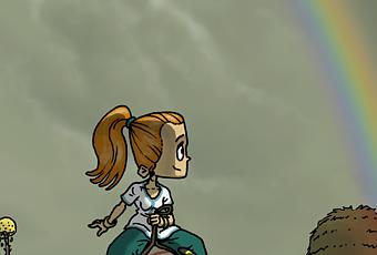 Je n'ai jamais fait d'arc-en-ciel, et pour cause, quand on en voit en vrai, c'est toujours un moment un peu magique mais tellement furtif qu'il est vraiment difficile de s'en souvenir assez bien par la suite pour pouvoir le peindre dans une illustration ou une case de BD. Et puis Je suis tombé sur le blog de Katara, où y'en a plein en photo alors... Alors l'idée m'est venue, comme un défi, de m'essayer à lui en faire un. Le risque était grand de faire quelque chose de naïf, mais je crois que je m'en suis bien sorti.