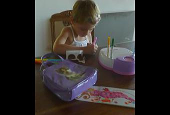 Ces retrouvailles à quatre, après un long mois de trafic d'enfants entre les grands-mères et les copains, ont été l'occasion de faire la fête à la jeune demoiselle et de lui faire un vrai cadeau de grande : une fabrique d'autocollants et de badges.