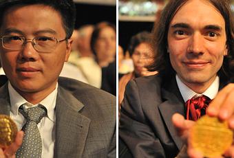 Les Français Ngo Bao Chau (université de Paris-Sud) et Cédric Villani (Institut Poincaré) posent avec leurs médailles, jeudi à Hyderabad, en Inde. Crédit photo : AFP/Noah SEELAM