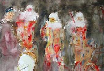 C’est cette ambiance que j’ai voulu traduire ici, avec la foule en arrière plan, dans le noir, à peine suggérée, les trois gilles qui apparaissent eux en pleine lumière et puis plus effacé, un joueur de tambour. Une opposition entre la nuit, la pénombre, le noir et la lumière.