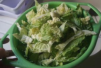 Pendant que l'eau chauffe, je coupe le chou en morceaux et je le rince. Quand l'eau bout, j'ajoute du gros sel, j'y plonge le chou (c'est là qu'il est intéressant d'avoir plus qu'une grande casserole) et je le laisse 5 minutes à partir de la reprise de l'ébullition. En même temps, je fais revenir les lardons dans une poêle .
