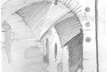 Il craint le mirage, se souvient de Tintin, des Dupontd... mais d'approcher le réconforte, la forteresse est là, majestueuse, orientale avec ses longues tours effilées et ses créneaux ouvragés, fraîche avec ces palmiers dont la cime dépasse des murs d'enceinte. Il frappe au lourd portail qui en ferme l'entrée et qui s'ouvre sur une agitation inattendue. S'il craignait le mirage, l'hallucination tintinienne, en approchant la forteresse, il a maintenant l'impression d'être en plein délire. Comme il reste planté là, le garde qui a ouvert le portail le prend par le bras et l'entraîne à l'intérieur pour pouvoir refermer. Notre marcheur se laisse tirer, hagard, mais ne fait pas un pas supplémentaire et reprend sa pose sylvestre.