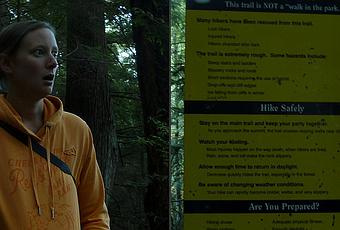 Mais là j'avais une fumeuse qui malgré son jeune âge et sa grande forme n'a pas passé assez de temps à Vancouver pour devenir une sportive acharnée et n'a jamais affiché un intérêt particulier pour le yoga ou le beach volley (au hasard). Bref, la descente, pour une fois, je ne l'ai pas faite seule. Elle va me manquer, Nelly! La voilà prenant connaissance de la difficulté du chemin à venir: