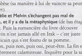 Heureusement, certains résistent et pas que dans les profondeurs des sphères intellos. Pour preuve, la dernière critique réjouissante que j'ai lue, c'était dans Grazia, où le journaliste Didier Jacob s'est attaqué bille-en-tête au mythe Nothomb. Et ça fait mal :