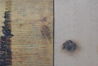 1- Série " motets " 40x20 cm , bois, vernis, papier brûlé, colle, pigments .