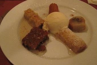 Et on passe au dessert. Assiette de pâtisseries grecques pour moi, j’en rêve depuis plusieurs heures déjà. Finalement, peu importaient l’apéro et le plat, tant que j’avais mon dessert dégoulinant de sucre pour terminer en beauté. Alors, on termine en beauté, en devisant sur ces cinq mini pâtisseries hyper alléchantes… bien que l’une d’elle ressemble fortement à un Tampax… ou plutôt à un OB. Discussions intellectuelles de filles, je vous disais.