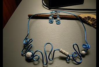 Parure en fil d'aluminium bleu turquoise, perles en bois blanc
