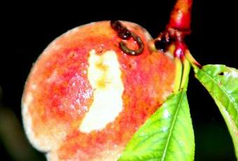 Le 30 septembre j'ai cueilli les dernières pêches du pêcher 'Lacrima'. Celle-ci déjà bien rongée portait un indice sérieux : une crotte.