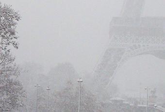 2 Photos de la Tour Eiffel sous la neige prise aujourd’hui 8 decembre.