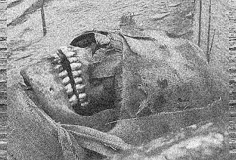 Après avoir retiré toutes les bandelettes, je découvris à même le corps un second suaire intégralement noir, parfaitement conservé et encore souple. En le décollant progressivement, je parvins à le soulever sans l'abîmer. C'est alors que je vis la plus effroyable des momies. Sous mes yeux, des fragments de corps étaient disposés, agencés comme les pièces d'un puzzle macabre. La dépouille semblait avoir été débitée de manière aléatoire, certains morceaux ayant été enlevés tandis que d'autres avaient conservé leur place originelle. Le visage avait été amputé comme suit : il manquait le nez et les oreilles, mais pas les yeux ni la bouche. On avait ôté un anneau de chair au niveau du cou, entre la tête et le tronc, la cage thoracique était trouée en son milieu, il manquait par-ci par-là des bouts de membre et de chair, les organes avaient tous disparu sauf le foie, les poumons et le cœur. Et l'horreur ne s'arrêtait pas là : il n'y avait qu'un pied, il manquait trois doigts à l'une des mains, un genou était absent d'un côté et un mollet de l'autre, le bassin était scindé en deux et l'une des cuisses avait perdu un muscle. C'était comme si un monstre, suivant son fol instinct, avait dévoré une partie du corps ou qu'une effrayante machine avait mutilé la chair de façon imprévisible.