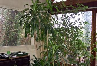 La maie et la table basse sont occupées par des boutures et des semis, la table à l'extérieur aussi. Comme repère de la taille des plantes : le bas de la grande vitre triangulaire est à 3m. La grande plante à gauche est un Dracaena fragrans 'Massangeana'. Il se fait expulser à l'extérieur dès qu'il fleurit car son délicieux parfum est si intense le soir que c'est insupportable. A sa droite c'est un Ficus benjamina. C'est la seule plante qui ne sort pas à la belle saison parce qu'on dit qu'il ne supporte pas les déplacements.
