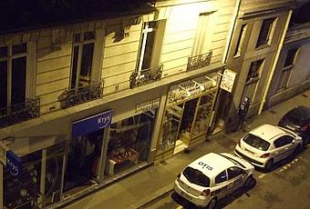 Photo prise la nuit sans flash et sans zoom, quand la ville est encore endormie, légèrement recadrée pour serrer un peu plus le vrai sujet de la photo, le clochard qui dort sur le pas de la porte de la boutique.