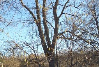 Il est grand et ses fleurs sont situées bien haut. Elles sont photographiées au téléobjectif. Les chatons sont plus longs que ceux de avellana et ce jour ils sont vert très pâle, un beau vert d'eau, ce que la photo ne rend pas.