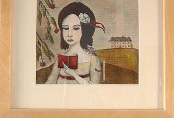 Ma cliente souhaitait pour la destinatrice de cette peinture, liseuse invétérée, un portrait évoquant une certaine dame de Lettres française, une ambiance un peu bucolique (d’où la tenue, les fleurs, les rubans), le chat bien-aimé, l’amour des livres aussi… et voilà, ainsi est apparue « Anne-George de Nohant »!