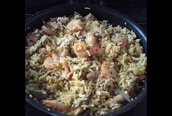 Quand mon riz a bien tout absorbé et que mes crevettes/oignons m'ont semblé à point, j'ai joint le tout dans la poêle à riz.