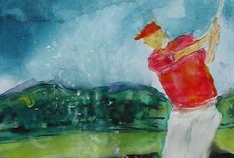 Un bunker c’est aussi un obstacle technique sur un parcours de golf. Il s’agit d’une dépression, d’un pli artificiel du terrain, rempli généralement de sable. Quand le joueur y envoie sa balle, il ne lui reste plus qu’à la sortir avec club en fer appelé « Sand-Wedge » opération délicate et bête noire des débutants.C’est cet « incident de parcours » que j’ai traduit dans mon aquarelle