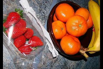 Elle a pressé ces clémentines dans un bol, couper la banane et les fraises en petits morceaux