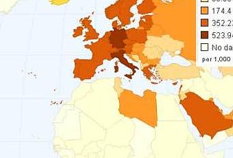 Une infographie sympa et facile, bien qu'en anglais, sur le nombre de véhicules personnels, moins de neuf places et plus de deux roues, à travers le monde. Après les Islandais, les Italiens et les Allemands possedent plus d'une voiture pour deux... L'Angola, au contraire, avec huit Peugeots pour mille rebelles reste en dernière place (chiffres 2002).