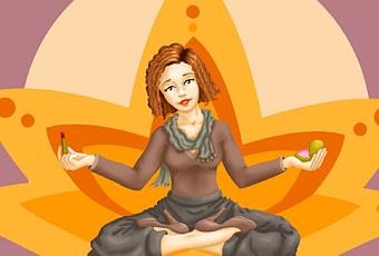 J’avais envie de faire un dessin qui me ressemble dans son approche, avec le côté zen de la pose lotus du yoga, à la manière d’une déesse hindou, et d’y ajouter le côté glamour et à la mode, féminin, d’où les escarpins, le tube de rouge à lèvres et le poudrier. C’est l’idée de départ sur mon crayonné préparatoire. Les couleurs orange et taupe son aussi dans l’air du temps, mais ça, c’est juste que ce sont des couleurs que j’aime… J’ai également fait ce dessin sans mon trait noir de contour que l’on retrouve très souvent dans mes créations, pour me démarquer un peu du côté jeunesse et en faire un visuel plus actuel. Et quel que soit le résultat des votes (qui commencent demain sur son blog), j’aurais été ravie d’avoir travaillé sur ce projet !