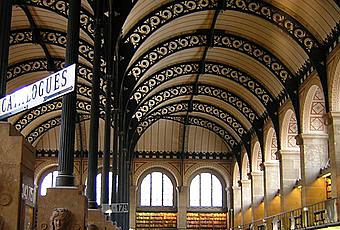 Encore un bibliothèque parisienne, située à côté du Panthéon, elle porte évidemment le nom de la montagne sur laquelle elle est construite : La bibliothèque Sainte Geneviève.Classé aux Monuments Historiques, elle est l’oeuvre de l’architecte Henri Labrouste en 1851. Retenez ce nom, je vous en reparlerai pour une autre bibliothèque ! ;)Pourquoi la voûte est extraordinaire ? Parce qu’il s’agit d’une structure métallique : l’usage du fer, autrement que dans l’architecture industrielle. Labrouste est un des premiers à faire ça : l’usage de matériaux peu nobles (fer/verre/béton) pour des lieux prestigieux. A l’époque, on construit en béton armé, mais on le cache. Voyez l’opéra Garnier quelque année plus tard : une structure métal-béton caché sous les ors, les marbres et l’artifice.La voûte de la bibliothèque Sainte-Geneviève, son plan rectangulaire en deux travées (deux allées voûtées) très fonctionnel revient aux sources des scriptoriums moyenageux. Et comme à l’époque romane et dans l’architecture cistercienne : les zones clefs de l’architecture sont visible, soulignée simplement et non dissimulée au public.Ok, j’arrête, je vais pas vous faire un cours sur l’architecture ! Vous avez vu, j’ai presque réussi à pas mettre de livres (ils sont tout petits, ça compte pas )