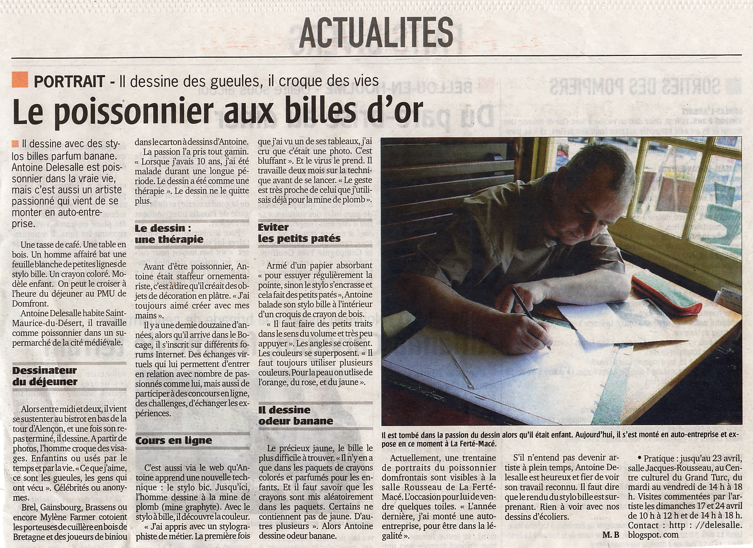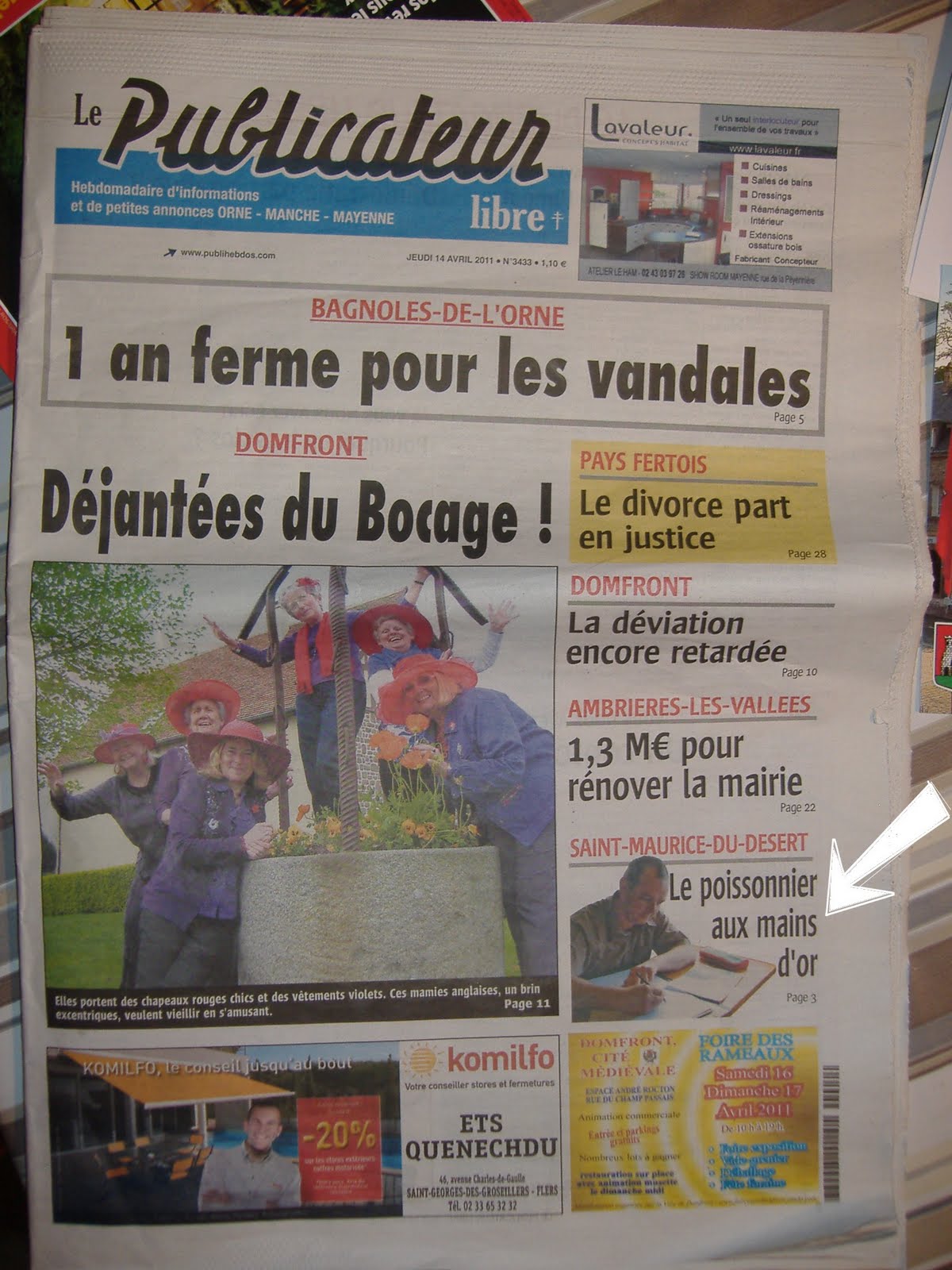 Et voilà, la presse en parle encore, en couverture du " Publicateur libre " , et en page 3, donc, visible dés le journal ouvert ! Vraiment SUPER ! ! ! Merci à eux et merci à la journaliste, rédactrice en chef,Marie B, qui à eu la gentillesse mardi de venir m'interviewer au PMU de Domfront.
