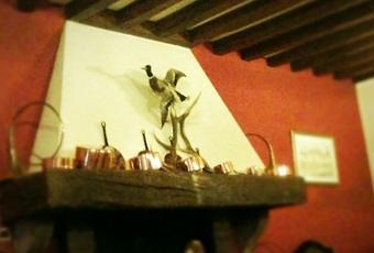 Sur le pourtour de la cheminée trônent des casseroles en cuivre et leurs couvercles, et des cors de chasse patinés par les années. Peut-être les siècles. Sur la conduite, un canard empaillé, immortalisé en plein vol. Belle bête.