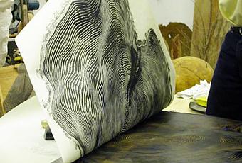 Brian Nash Gill a eu l’idée de prendre la coupe des troncs d’arbres et d’en reprendre les motifs. Ce travail est physiquement impressionnant. Tiens, demain je vais demander aux gardes-forestiers un bout des restes d’un arbre millénaire, je pourrais en imprimer l’âge.
