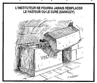 Mais ne le videz pas, le pot de vaseline, même si ça vous fait très mal. Vous en aurez encore besoin lorsque notre président Duracell, pour la plus grande satisfaction des sectes et autres églises folkloriques, s 'attaquera à la loi de 1905, reprenant le vieil adage suivant lequel « la religion est l'opium du peuple » et que ce qu'elle peut imposer de désinformation et d'obscurantisme par superstition et auto-discipline est autant que le pouvoir n'aura pas à obtenir par la propagande ou la force. Pour le moment, il assouplit l'environnement et prépare le terrain, par des discours du genre « Latran » et « Ryad ». Témoin ce brillant dessin de Cardon dans le Canard Enchaîné du 30 janvier 2008.