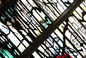 Graphisme sur les vitraux de l'église St Gervais, communauté de Jérusalem à Paris
