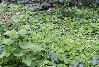 C'est la lunaire vivace. Elle n'est pas spontanée ici, je l'ai plantée. Elle fleurit toujours un peu plus tard que la lunaire bisannuelle. Elle ouvre ses premières fleurs le 14 avril sur son tapis d'aspérule odorante :