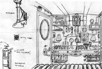 Voici les commandes de la machine. C'est encore un exemple du travail à "4 mains" avec Mike. Si les annotations et le dessin sont de moi, on a réfléchi à deux sur les éléments que vous voyez,. Certains sont de moi, d'autres de lui, et chaque élément a un sens, une fonction... Et même là, sans mes notes, impossible de vous dire à quoi sert tous ces bidules !