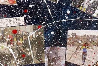 En voyant les images des personnes en train de fouiller dans leur ville en recherche de nourriture, en train de récupérer tout ce qu'ils pouvaient, en s'inquiétant le la centrale et des répliques du tremblement de terre, au milieu des cadavres et des destructions les plus épouvantables, je me suis dit que le seul moyen d'en parler dignement était de faire de la récupération pour une expression vraie de ce véritable tremblement de terre humain:palette de bois, planche en bois reconstitué, acrylique, découpage de photos récupérées dans des journaux jetés, brosse à dent pour projection de peinture, vernis.