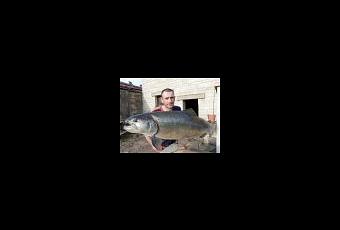 Fabien avec un monstre, une truite de 82 cm prise sur la Saulx à la manne sur une canne à l'anglaise montée en 17 centième, Bravo!!!