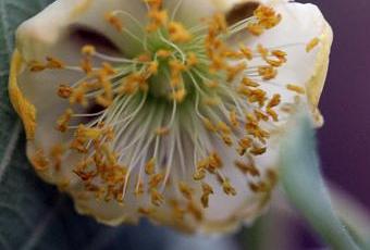 Les fleurs du mâle montrent au centre uniquement de nombreuses étamines aux très longs filets. Sur les photos de face on devine une forme ronde, un pistil très atrophique sans aucun des attributs du pistil :