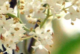 Nous avons déjà vu les fleurs des lilas-Syringa. Elles sont petites mais groupées en grand nombre sous forme de grappes appelées thyrses. Elles ont 4 pétales, 2 étamines et 2 carpelles. Les pétales sont soudés en forme de long tube qui cache les organes sexuels au cœur de la fleur. On arrive à voir les 2 étamines sur les fleurs de Syringa pekinensis parce que le tube est plus court. Sur cette photo on voit bien que la fleur marquée par une flèche qui présente l'avantage d'être bien isolée des autres n'a que 2 étamines :