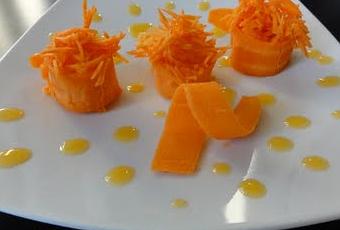 Pour refaire ma présentation en maki, découpez une carotte en tagliatelle grâce à un épluche légumes, puis réalisez une fente à chaque bout des tagliatelle et assemblez. Rajoutez les carottes et les oranges à l'intérieur.