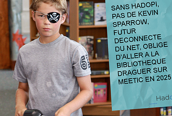 Si vous voulez vous aussi créer votre pub hadopi c'est chez Numérama Alors Meetic, je suis désolée Kevin mais même pas en rêve, hein tu évites la bibliothèque ! Cette fausse pub d'ailleurs me fait un peu penser à une autre pub, elle bien vrai, hélas, pour la prévention des risques liés à la canicule incitant les personnes âgées à aller se mettre au frais dans les bibliothèques ! Pareil hein, vous évitez, la clim c'est même pas en rêve !J'aime bien cet exemple, car même si il s'agit d'une blague, il colle bien à l'esprit de la campagne de pub Hadopi : en gros grâce à Hadopi nous n'aurons pas de Kevin dans nos bibliothèques ? (Ouf j'ai eu peur ;-) Mais surtout nous n'aurons pas "son amour m'emmerde, titre phare de la scène française en 2021" et cette fois il s'agit de la vraie pub, culpabilisons un peu : c'est très mal ! Tout ça à cause des vilains pirates ! (Ca c'est de la pédagogie !)