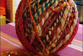 Au départ il y avait ça, une boule de saris recyclés d'un kilo et demi que j'avais acheté a l'aiguille en fête et que je m'étais coltiné toute une journée ce qui m'avait provoqué un déplacement du centre de gravité qui bizarement suivait la boule de sari chaque fois que je la changeait d'épaule et me donnait un air toujours légèrement penché !! j'ai attrapé mon crochet spécialement acheté pour, taille 12, que j'ai pété avant d'avoir fini le premier rang .... je me suis donc jeté sur le numéro 15 en espérant que ça tienne et ça a tenu, une improvisation totale et un soucis avant la fin ....pas assez de sari.... a peine une moitié de tapis !