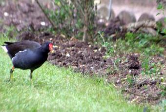 Les poules d'eau, souvent confondues avec les foulques, sont considérées comme très peureuses, beaucoup plus peureuses que les foulques et il est habituellement difficile de les voir et de les photographier. Quelle ne fut pas ma surprise d'en voir une à la fin de l'été dernier cherchant sa pitance dans les allées du jardin sans se préoccuper des visiteurs :
