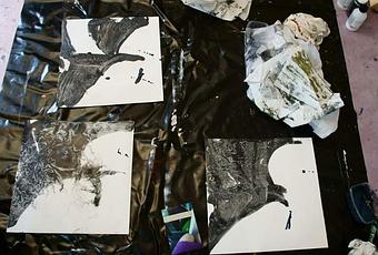 Je me décide pour un format carré -j'aime bien en ce moment, c'est pourquoi je mets du ruban de masquage sur l'image, afin de délimiter ce qui va faire l'objet de ma peinture. Une grande partie de celle-ci contient différents niveaux de gris, c'est pourquoi je décide d'utiliser mon graphite en pigment, qui donne une belle sensation argentée.
