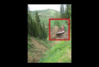 Comme c'est toujours le cas en été, j'étais impressionné par la forte pente, même pour ce couloir qui est de loin le plus facile du massif de Daly, et alors que mon regard parcourait le fond de la ravine, il s’arrêtait soudainement sur ce qui semblait être l'extrémité arrière d'une voiture enfouie sous la boue et envahie de végétation. En faisant très attention je descendais alors le lit escarpé du ruisseau formé par la fonte des neiges et m'approchais enfin de ce qui semblait être une Chevrolet Corvair Coupé, d'un beau rouge vif, construite dans les années soixante.