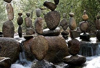 Mais de quoi s'agit-il au juste ? De pierres. De belles pierres rondes ramassées dans les rivières du Colorado, qu'il empile au fil de l'eau et de son imagination. Dis comme cela, ça peut sembler un peu ridicule ; mais avez-vous déjà essayé d'empiler deux pierres rondes et mouillées l'une sur l'autre, en équilibre sur le plus petit bout ? Et trois ? Et quatre ? Et huit ?
