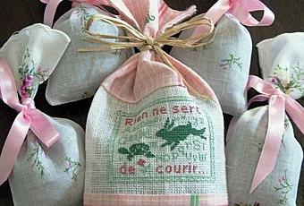 Bon, pas de quoi s'affoler, mais voici ma première petite production de lavande avec deux pieds plantés l'année dernière et un peu oubliés. Deux vieux mouchoirs vintages chinés chez Emmaus, une petite broderie qui trainaît dans mon panier, un bout de ruban rose et de raphia et voici mes petits sachets de lavande tout prêts à aller embaumer mes armoires.